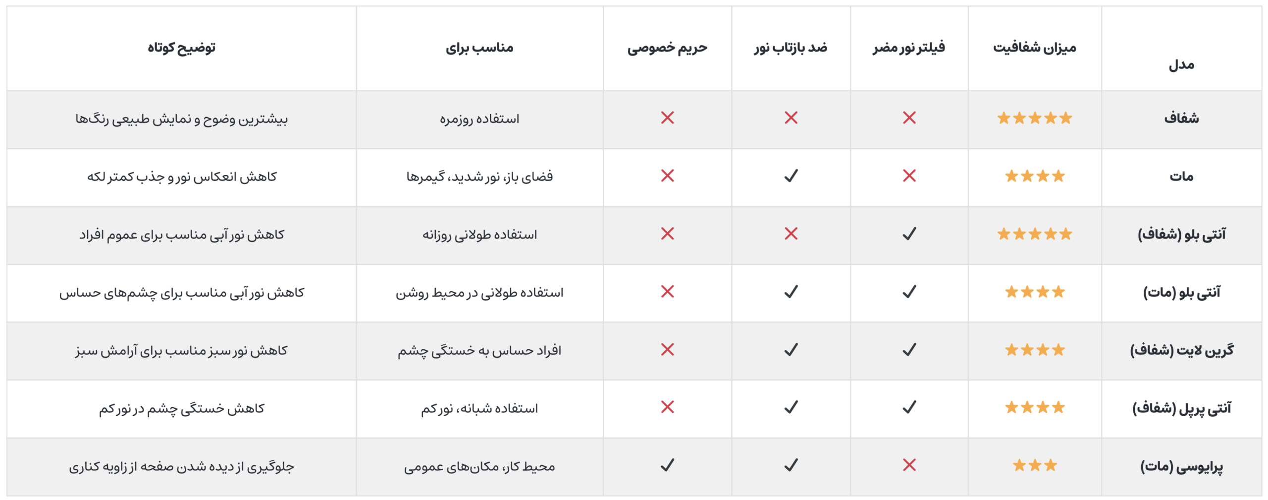 | مدل | میزان شفافیت | فیلتر نور مضر | ضد بازتاب نور | حریم خصوصی | مناسب برای | توضیح کوتاه |